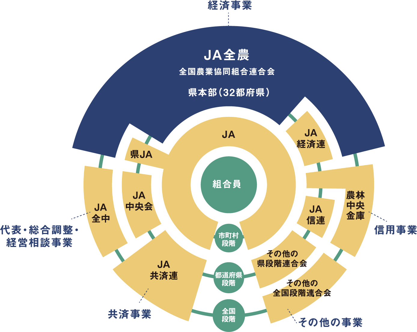 これらの事業をより効率的に行うため、地域のJAとともに、「都道府県段階」の組織と「全国段階」の組織で構成されているのがJAグループです。